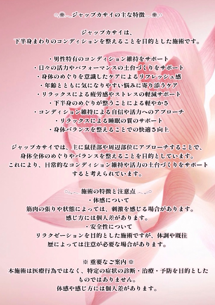 ・サロンでの待機をしていないセラピストも在籍している為、当日のご案内ができない場合がございます🙇🏻♀️
